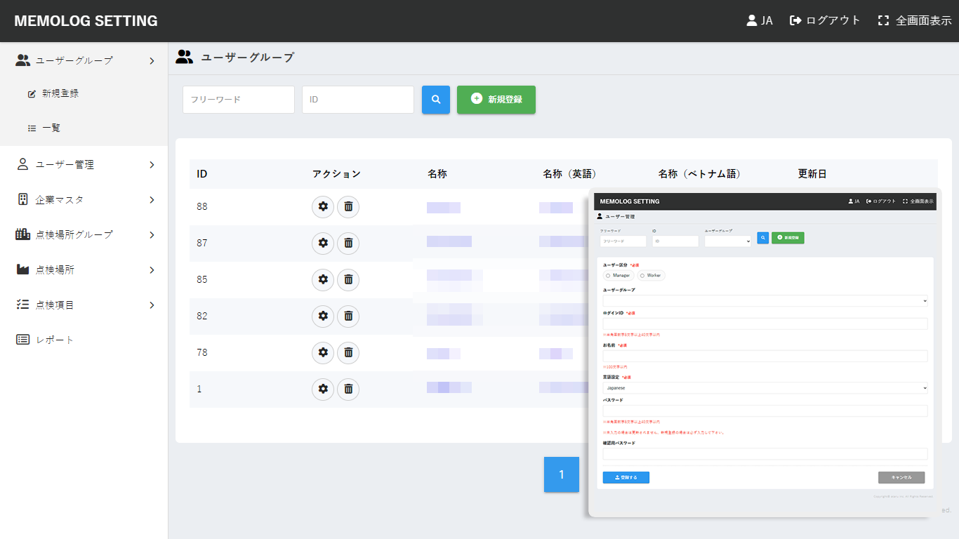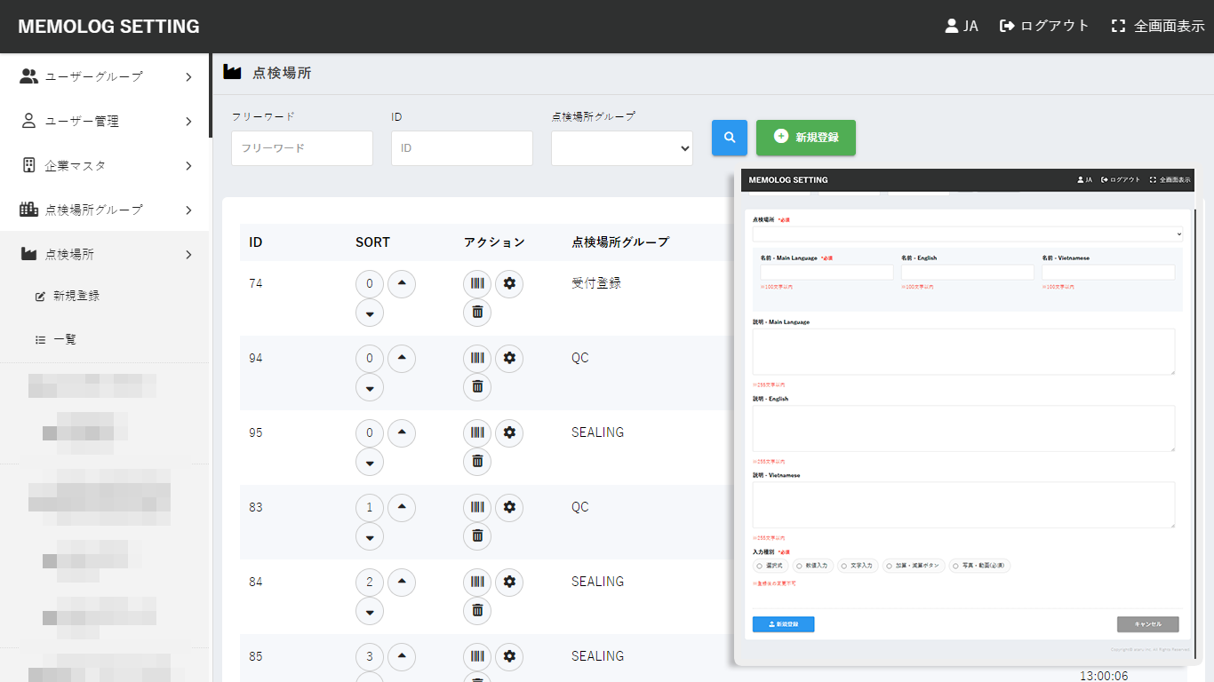 点検対象の場所や設備を体系的に管理できる機能です。点検が必要な施設や設備の情報を登録し、場所ごとの点検項目を設定できます。