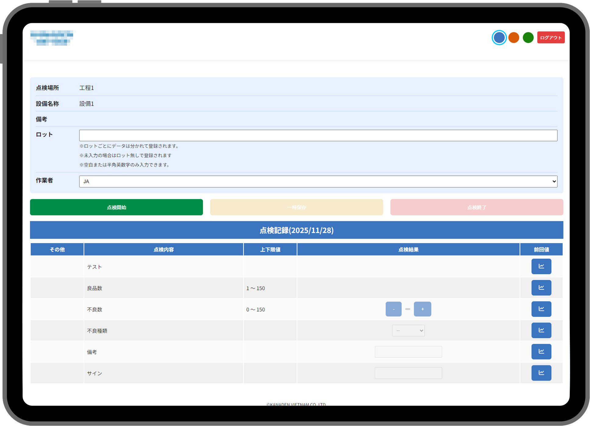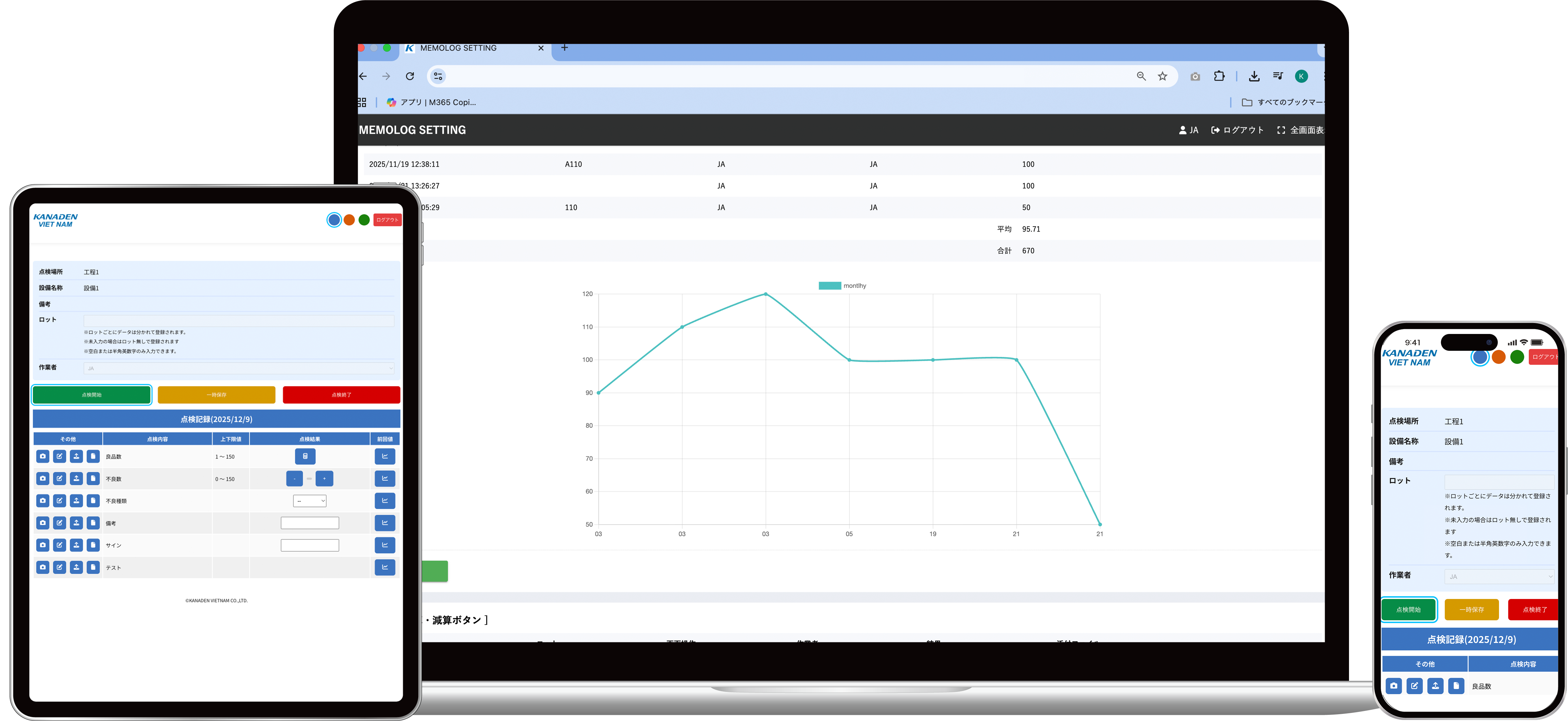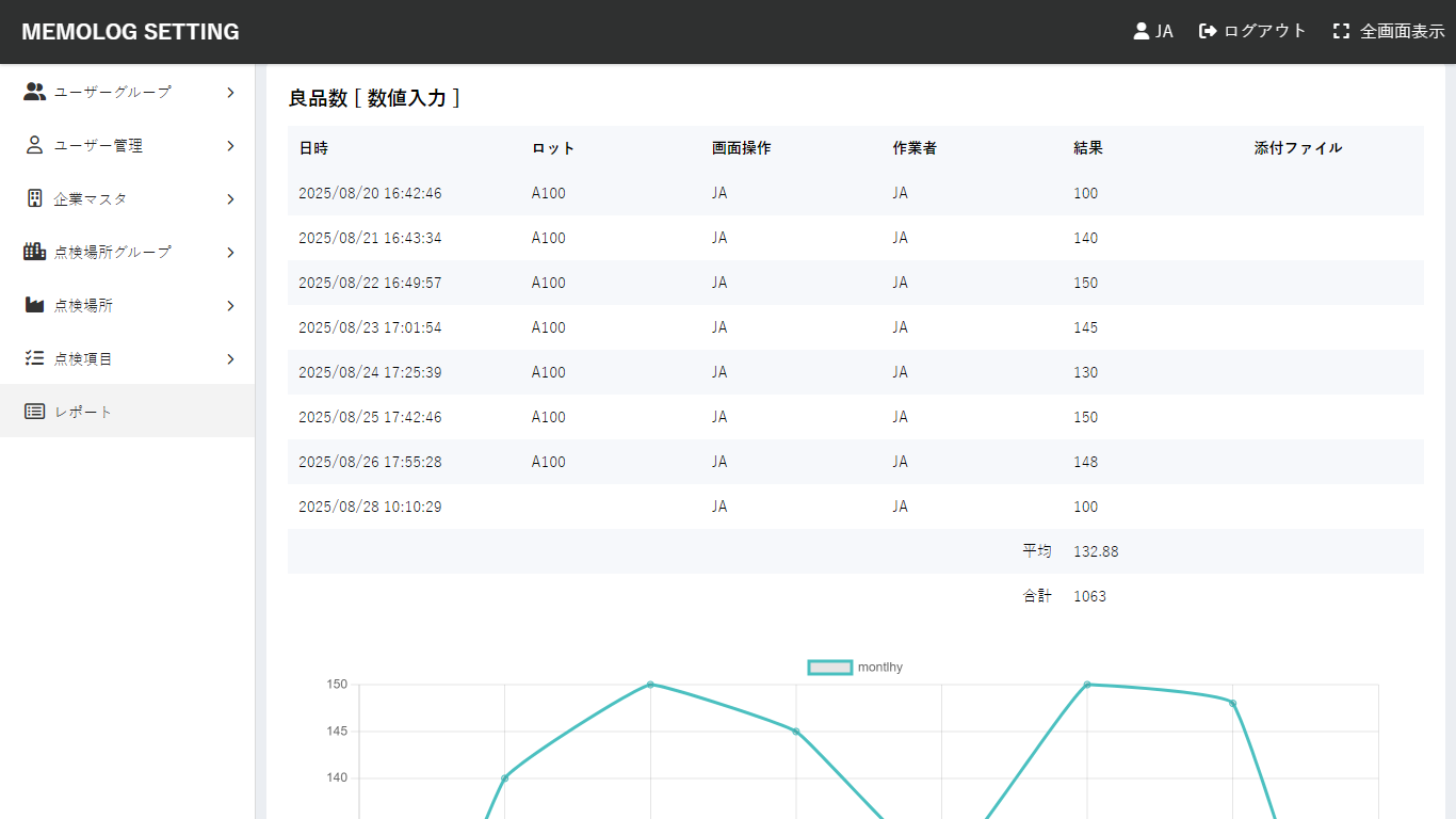 過去の点検データをグラフで表示し、履歴を確認できる機能です。傾向分析や異常値の早期発見に役立ちます。