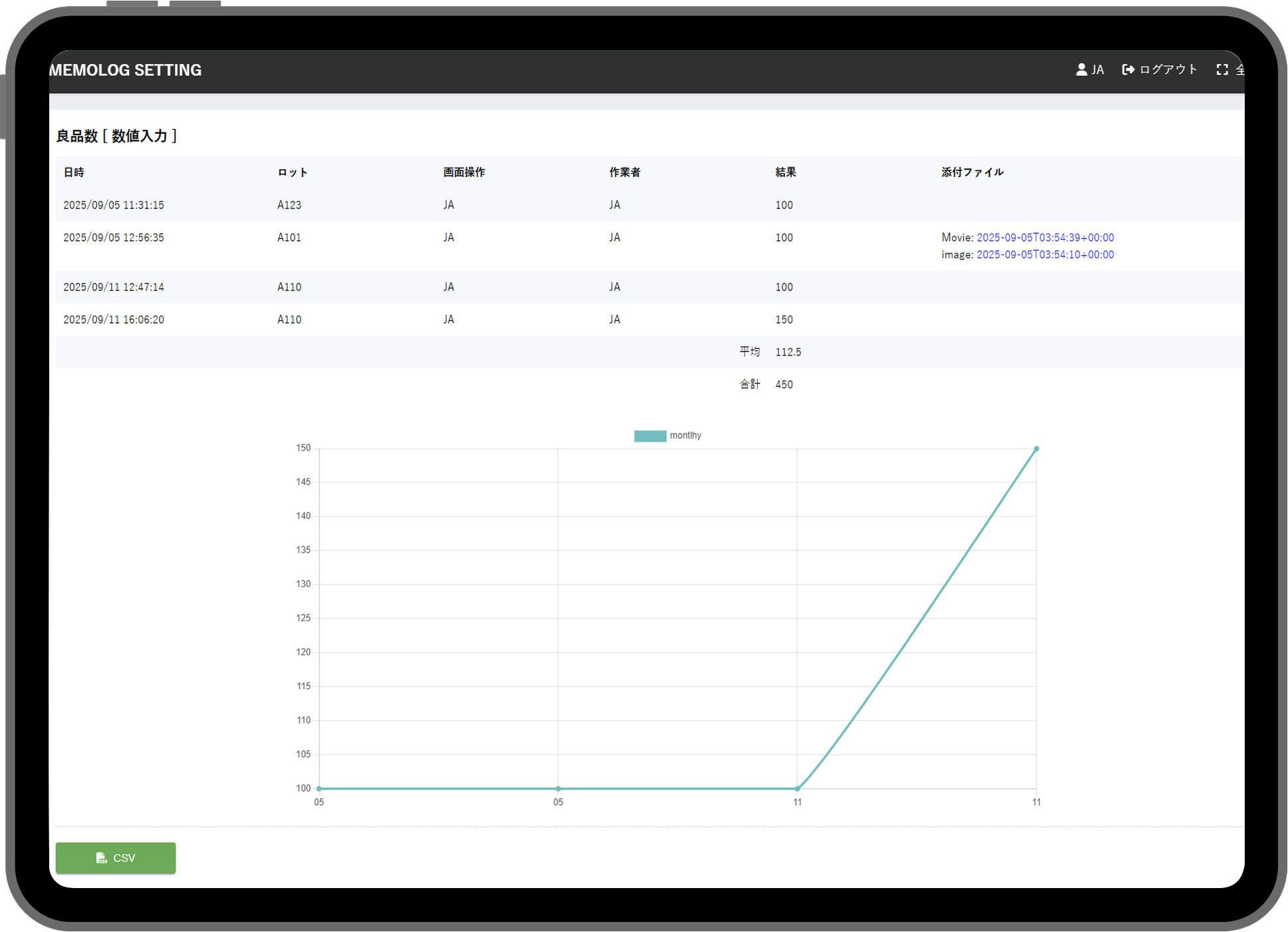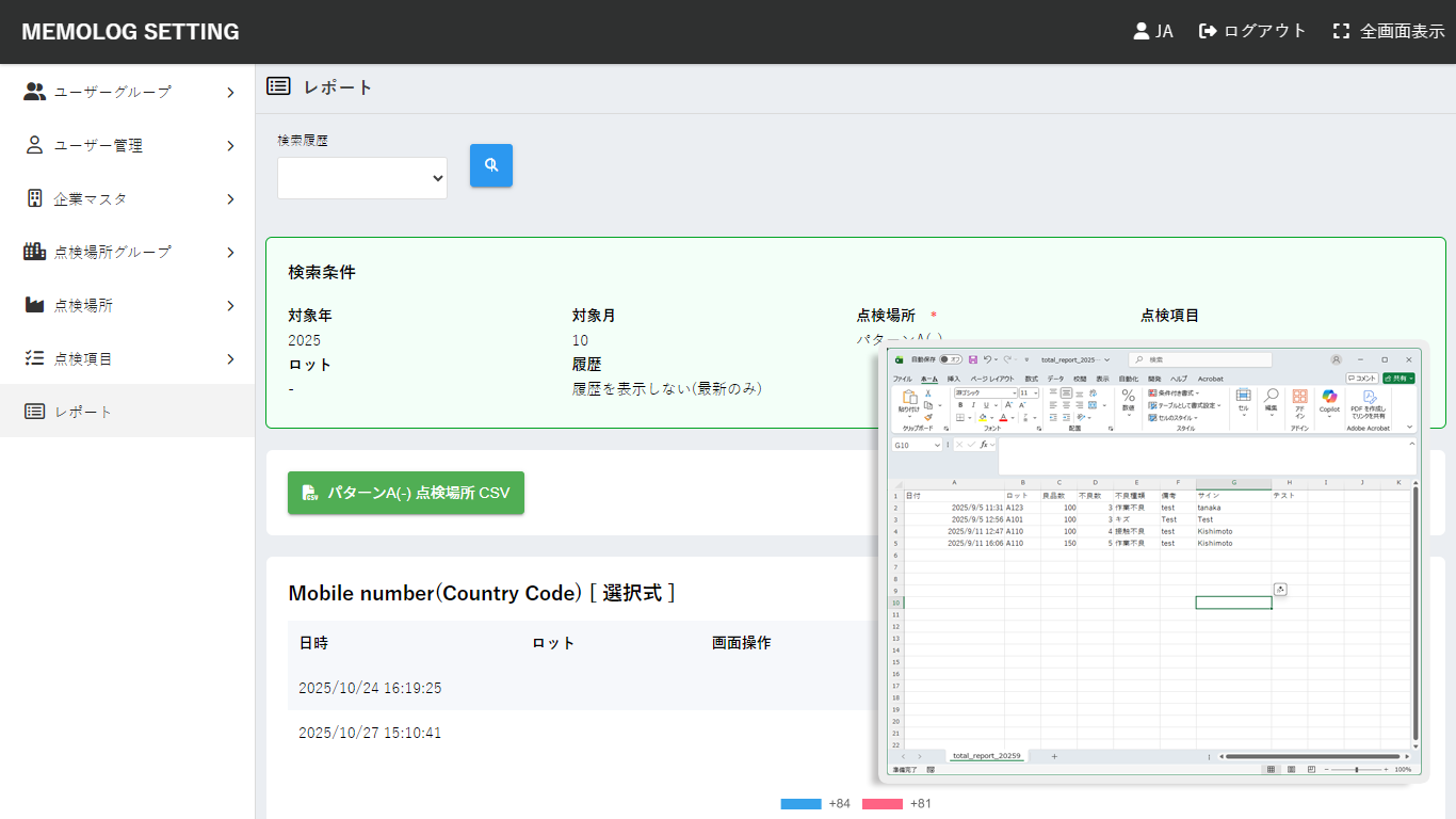点検データをCSV形式でエクスポートできる機能です。点検項目ごとの出力、全データまとめて出力に対応しています。