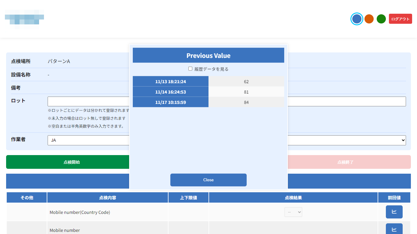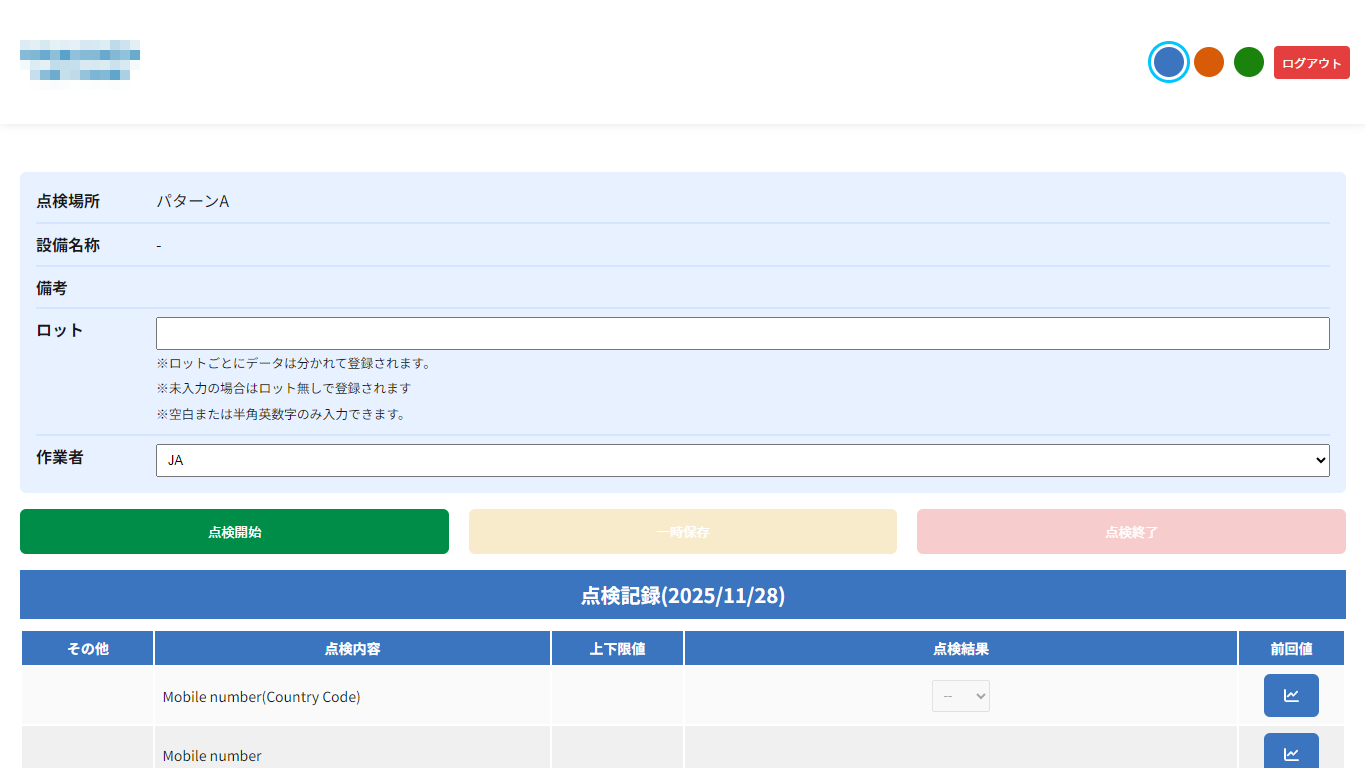ロット番号を入力して点検を開始する方法です。過去のロット履歴からサジェスト表示されるため、入力ミスを防げます。