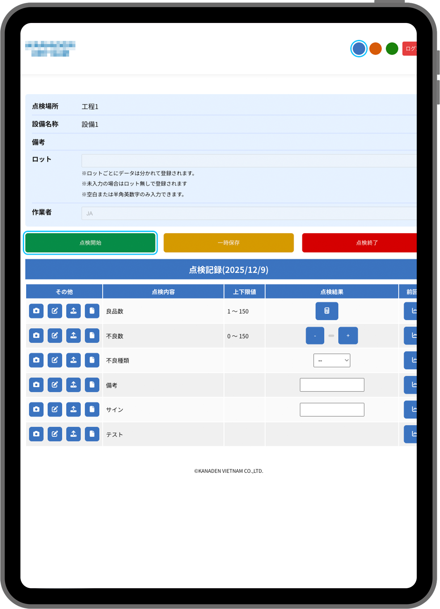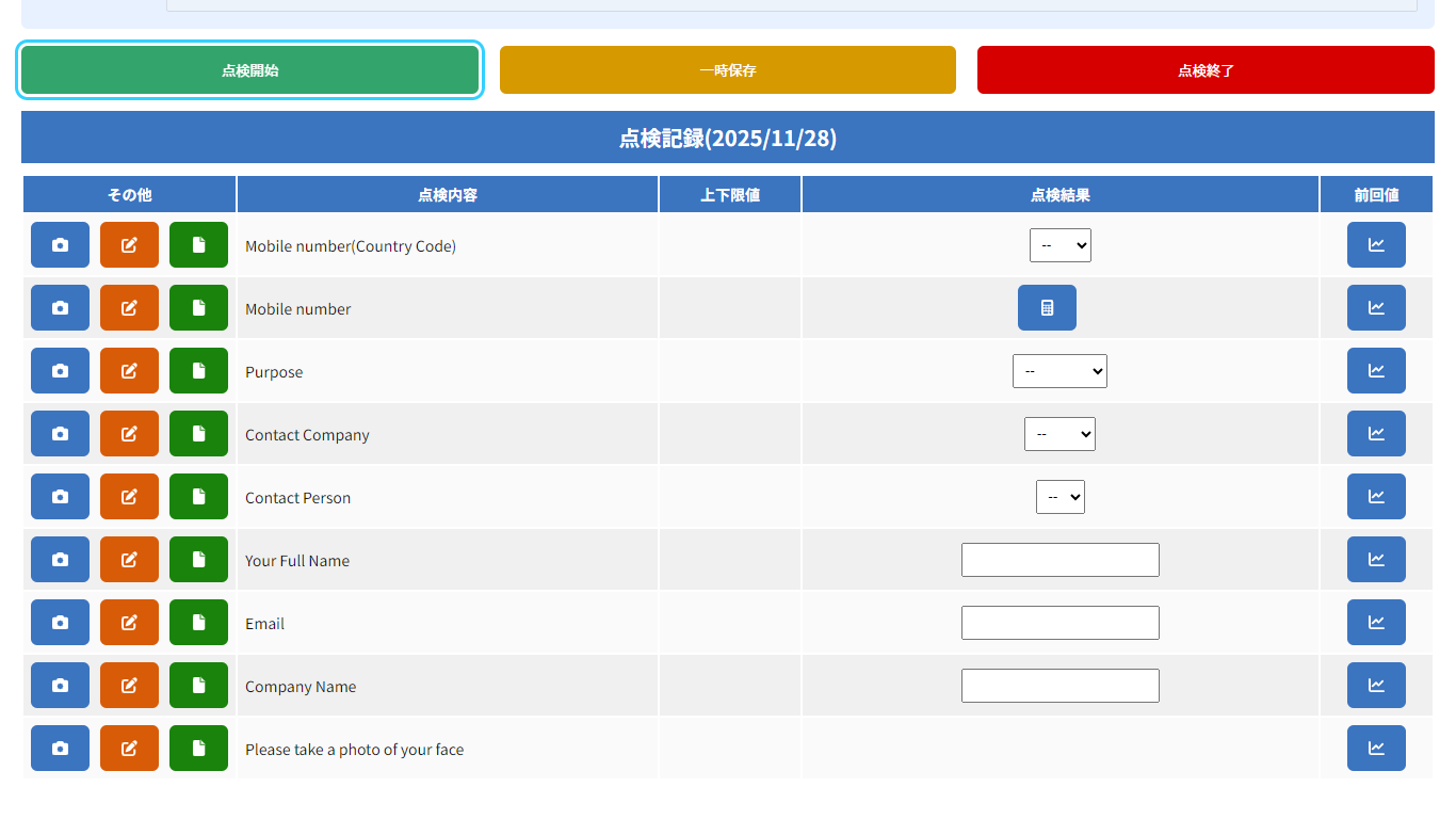 点検項目を入力するメイン画面です。数値入力、写真撮影、サイン機能など、多様な入力方法に対応しています。
