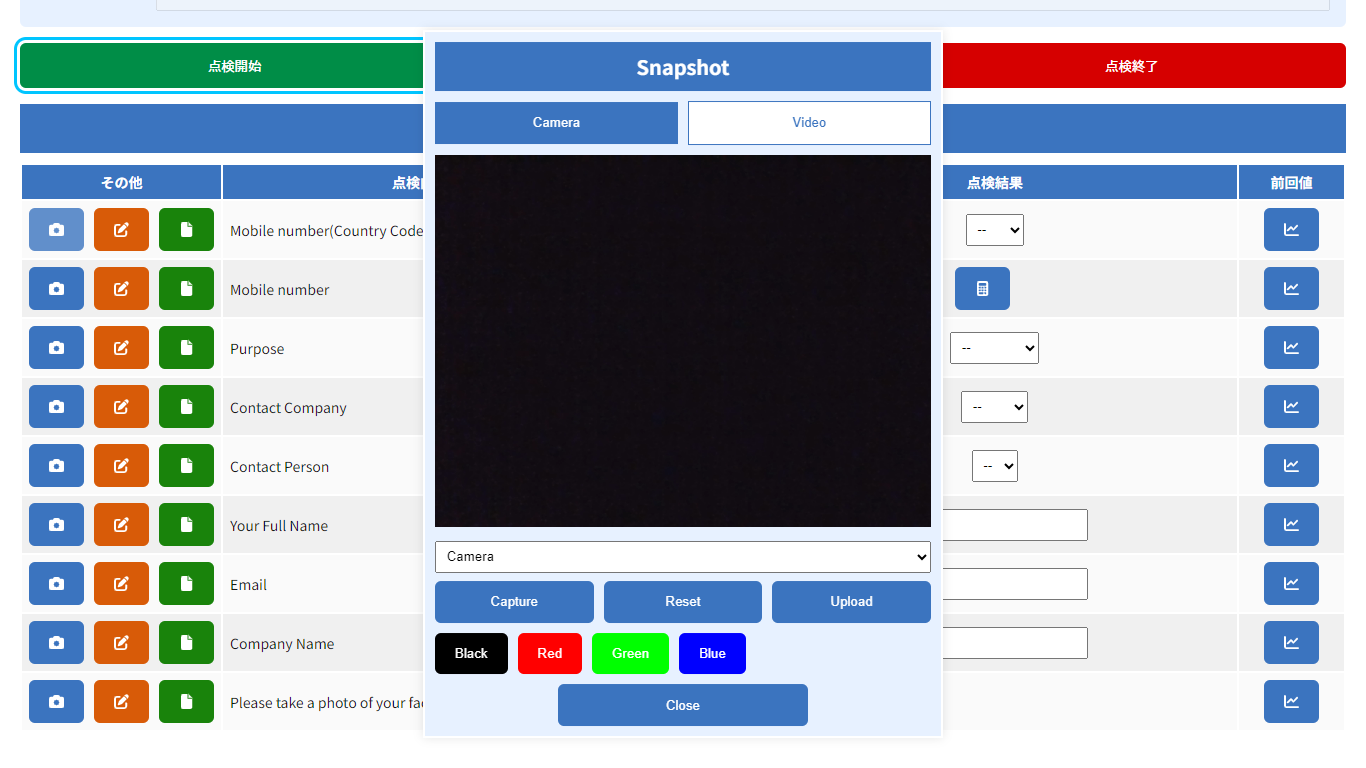 点検時の状況を写真や動画で記録できる機能です。撮影した画像に対して書き込みが可能で、ペンの色も選択できます。