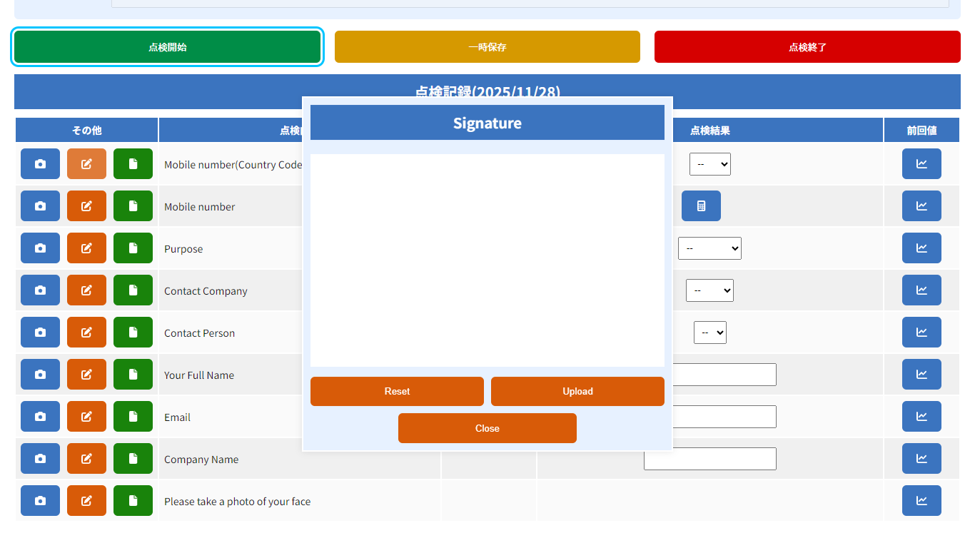 点検完了時に電子サインを記録できる機能です。タッチ操作で直接署名でき、紙の帳票が不要になります。